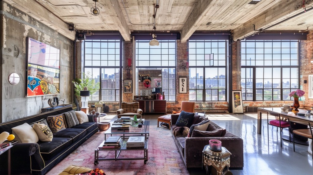 Large, bold artworks are perfect for filling the expansive walls of an urban loft. Choose pieces that reflect your personal style and add a splash of color to the space.