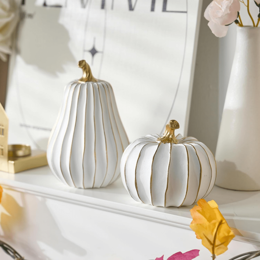 Complement the garland with decorative pieces such as the White and Gold Fall Pumpkins Decor. These varied-sized pumpkins allow for a balanced, festive arrangement.