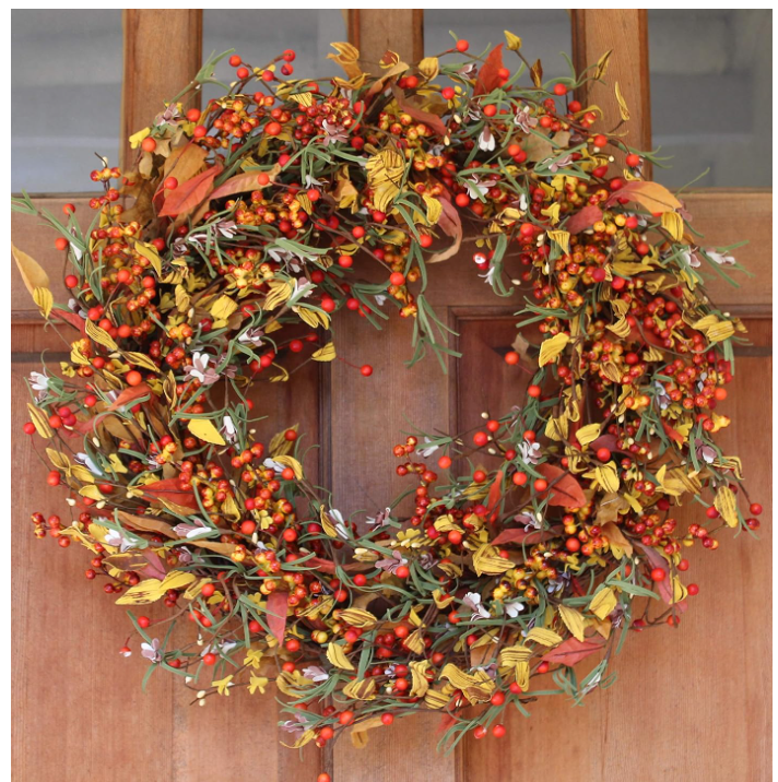 Start with your front door! The entryway sets the tone for guests, so make it inviting. A beautiful autumn wreath is a great choice. Check out the Cranberry Silk Fall Wreath on Amazon it’s full of bright cranberries, pinecones, and maple leaves. It’s autumn in wreath form! (For more option click here).