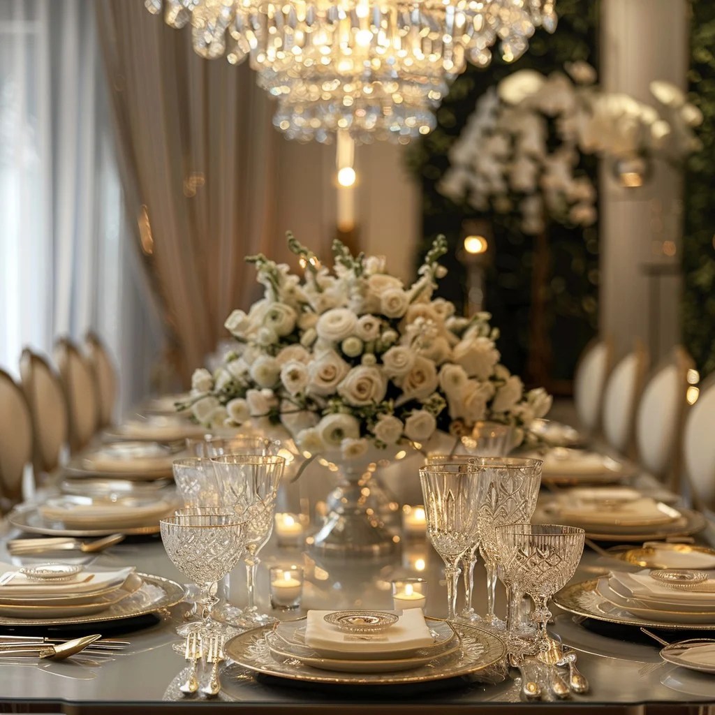7 – Modern Glam Dinner Setup with Metallic Accents and Maxi Centerpieces