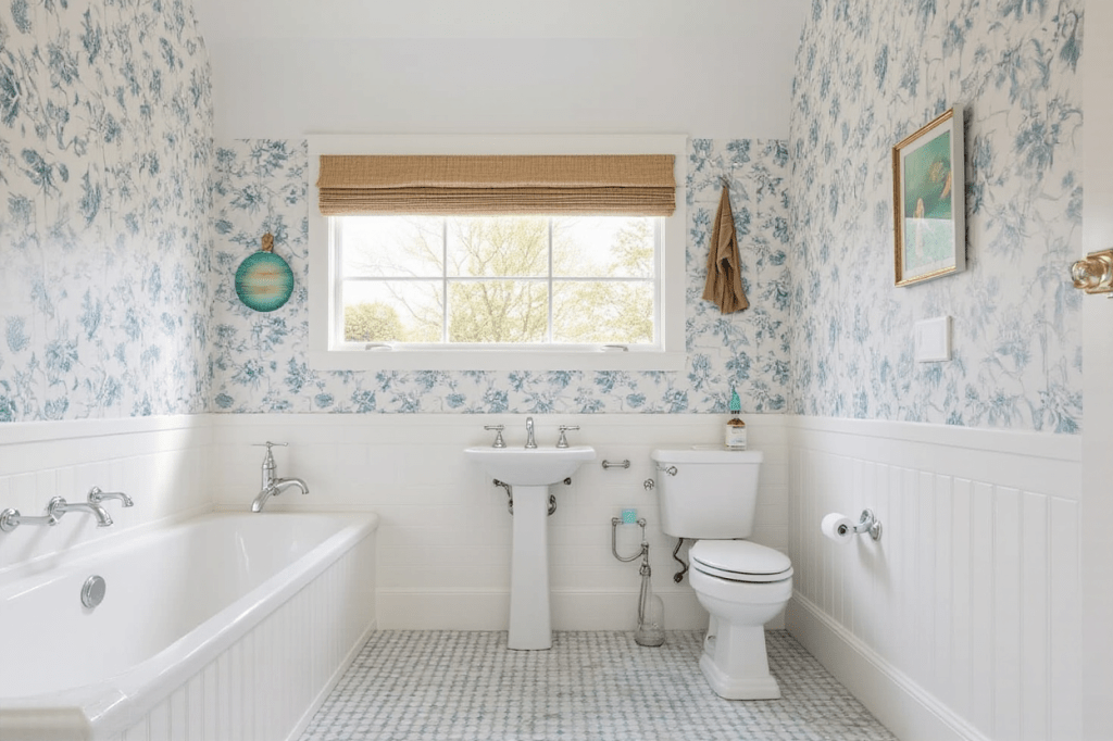1. Swap tiles for wallpaper with botanical or nautical patterns for an instant bathroom transformation