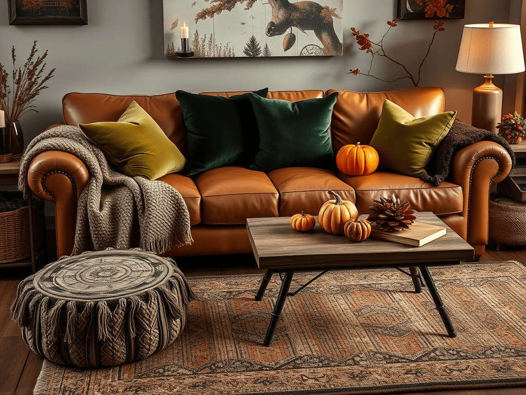 Upholstery choices matter enormously. For autumn, lean into rich fabrics velvet in jewel tones, leather in cognac or burgundy, tapestry fabrics with intricate patterns, mohair for its textural appeal. Consider a velvet tufted ottoman as both seating and a textural focal point.