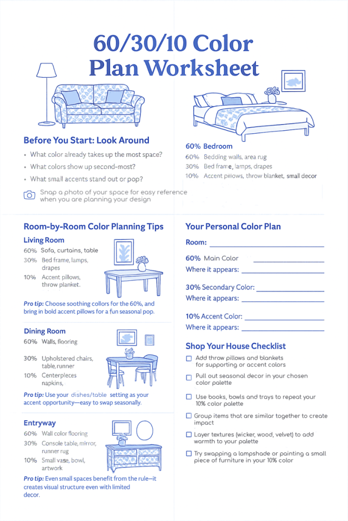 60-30-10 Color Rule Diagram: This shows exactly how to balance your bedroom color palette with 60% dominant color (walls, large furniture), 30% secondary (bedding, curtains), and 10% accents (pillows, decor) for maximum calm.
